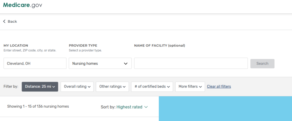 As you can see you can filter the nursing homes by their Overall Rating. You can also filter by their Health Inspection Rating, their Staffing Rating or their Quality Measures. You can also filter the nursing homes based on size. The search above is for all nursing homes within twenty five (25) miles of Cleveland, Ohio. You can limit your search to a five (5) mile radius. You can expand your search to a two hundred (200) mile radius. The web site also shows each nursing home on a map.
